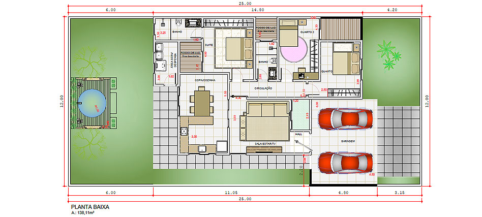 Este projeto é de uma casa moderna, com revestimentos e elementos de impacto. A planta é composta por garagem para dois carros, cuja permite acesso a um corredor lateral que acessa à parte dos fundos do terreno. A área social possui sala de estar / Tv e cozinha/ espaço gourmet. A área intima dispõe de 3 dormitórios, sendo 1 suíte com closet. Terreno mínimo de 12x25m, área total construída de 138,11m².