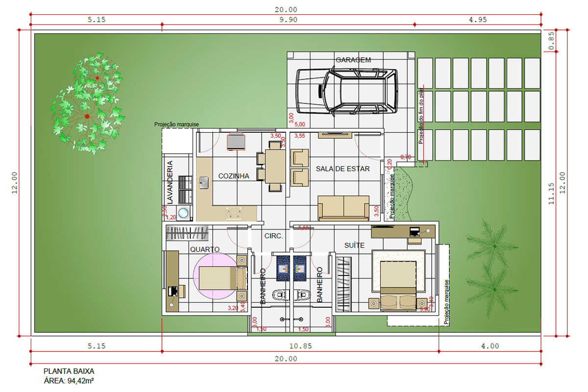 Este projeto é de uma casa econômica e compacta, com planta bem resolvida, ideal para terrenos pequenos, a partir de 12 metros de frente por 20m de profundidade. A planta é composta de sala de estar / TV, cozinha, lavanderia e garagem para 1 carro. A área intima dispõe de 2 dormitórios, 1 banheiro e 1 suíte. Terreno de 12x20m e área total construída de 94,42m².