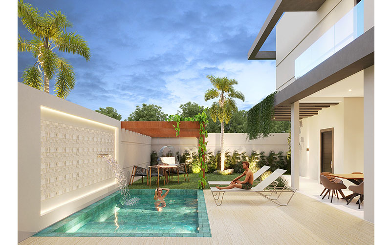 Um dos modelos de projeto mais solicitados por vocês: Casa com planta em formato da letra L. Nessa planta, disposta num lote mínimo de 12x22m, temos garagem para dois carros, com acesso direto à área de lazer. Possui um dos corredores laterais livres, dando acesso à parte dos fundos da casa. Através do acesso social, passamos por uma ampla sala de estar, passamos pela cozinha de uso diário, integrada por amplas portas em vidro à área externa da casa, que conta com piscina, cascata e pergolado com balanço. O térreo conta ainda com banheiro e lavanderia com espaço para depósito. No andar superior, a área íntima dispõe de 3 quartos, sendo 1 suíte master com closet e sacada. Terreno mínimo de 12x22m, área total construída de 182,78m² + piscina de 11,00m².